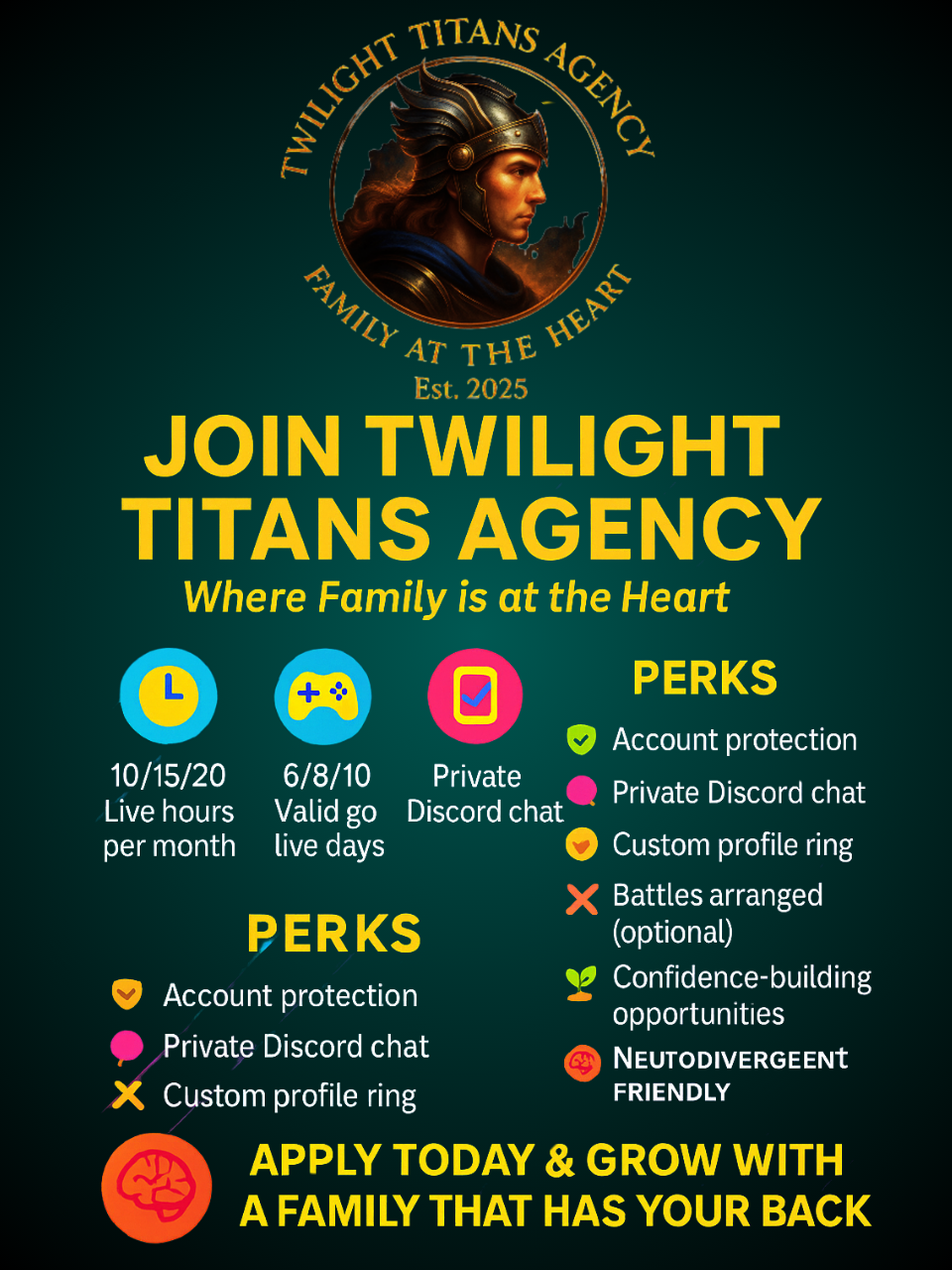 But it’s not just about the numbers 🔢. At Twilight Titans Agency ✨, we value the relationships 🤝 we build with our Creators 🌟. We’re also the first agency to adopt flexible creator hours ⏰, allowing you to work around life’s little surprises 🎁, and we fully embrace Neurodivergent Creators 🧠💡.